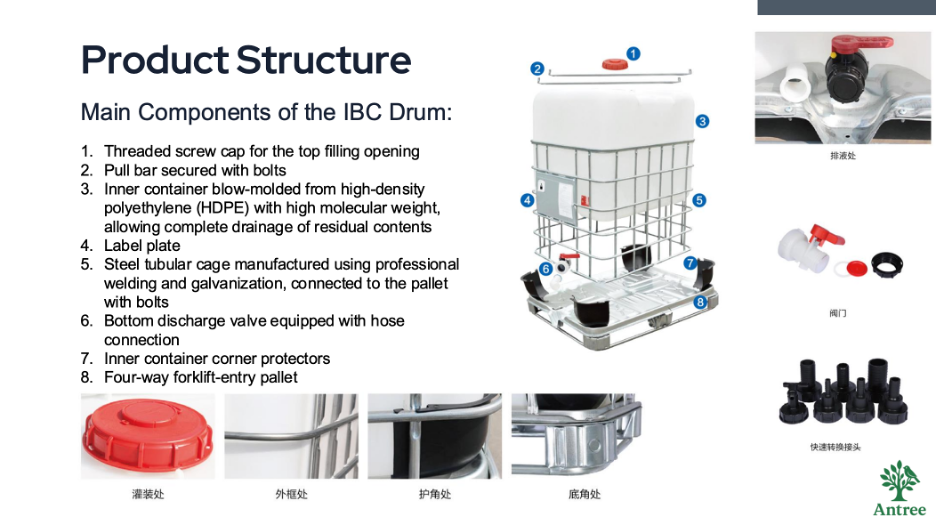 Our IBC tanks are primarily available in the 1000L (1‑ton) specification. They feature a high‑molecular‑weight HDPE inner bottle combined with a galvanized steel tubular cage, delivering excellent mechanical strength, chemical resistance, tight sealing performance, and reusability. These tanks are widely used for the storage and international transportation of chemical auxiliaries, detergents, industrial liquids, and related chemical products.